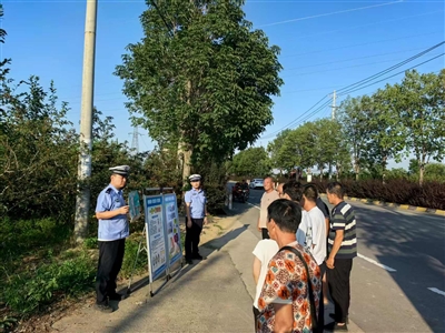 8月6日,韩城市公安局交警大队民警在芝阳村,开展花椒采摘期间交通安全宣传。