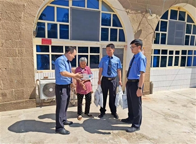 8月18日,榆林市榆阳区人民检察院干警前往榆阳区上盐湾镇陈崖窑村,开展以“生态环境检察 守护绿水青山”为主题的宣传活动。图为检察干警向村民讲解法律知识。