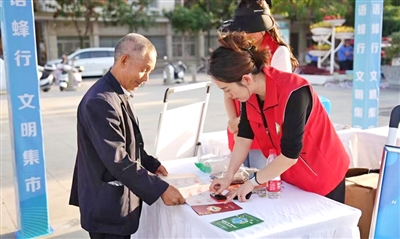 9月12日,黄龙县新时代文明实践中心在新时代文明实践广场主办了一场以“蜜语蜂行”为主题的文明集市活动。图为宣讲员向市民介绍集章打卡方式。通讯员 刘军 王星宇 摄