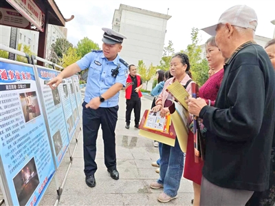 9月17日,宝鸡市公安局交警支队陈仓大队民辅警走进辖区群力社区吉祥小区开展秋季交通安全宣传活动。图为辅警向群众讲解交通安全知识。