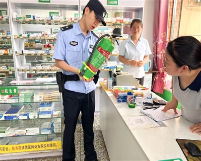 7月7日,西安市公安局鄠邑分局涝店派出所民警深入辖区,开展“食药环”领域安全专项检查工作。图为民警检查药店消防设施。陈杰钢 通讯员 杨新妮 摄
