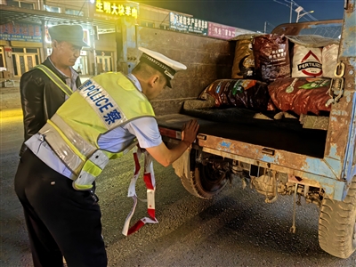 近期,正值辣椒、萝卜等蔬菜上市旺季,辖区群众夜间出行活动增多,定边公安交警大队白泥井中队针对实际情况,紧盯重要节点、重点人群,以实际行动守护群众出行安全。图为7月10日晚,民警给农用车辆粘贴反光贴。本报记者 张震 通讯员 谷英英 摄