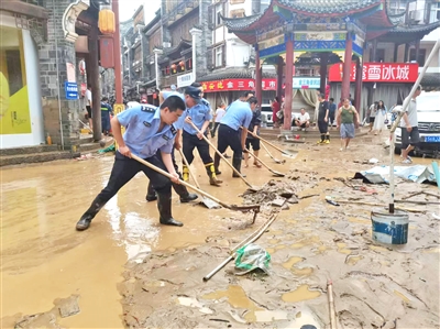 武警官兵是受灾后第一支进入漫川关镇的队伍。“我们12点左右赶到时,街道水位还很高,大家手拉手蹚水进来。”现场指挥员王青森表示,掌握了基本灾情后,他们先是在万福沟口水毁路面附近拉上警戒线,再清除群众家里和街面上的淤泥。